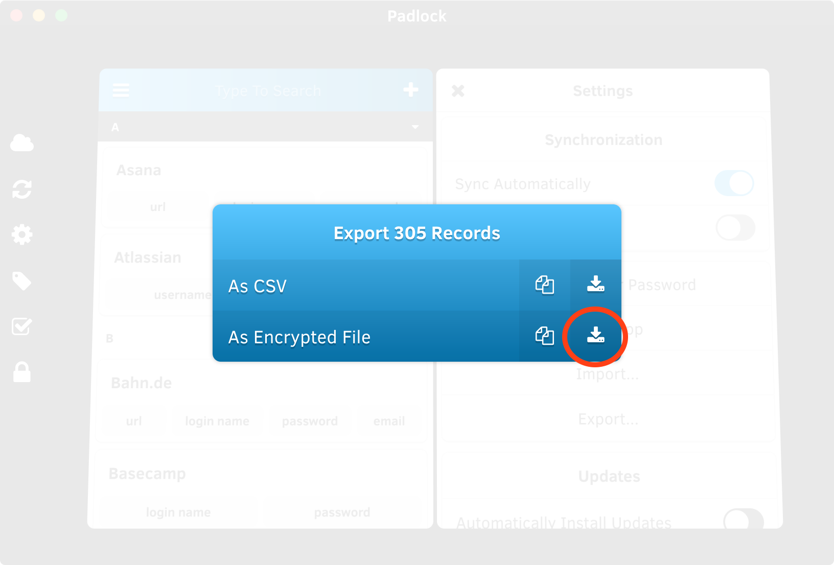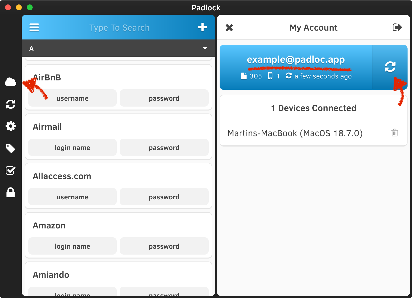 Before beginning the transition to Padloc 3, it’s a good idea to make sure your Padlock Cloud account is up to date with your data. To do this, open the legacy app and navigate to the My Account page (the little cloud icon on the left). There, you will see you accounts email address and the time of your last synchronization. Optimally, the latter should say “a few seconds ago”. If it doesn’t, just click the sync icon on the right to trigger a new sync.