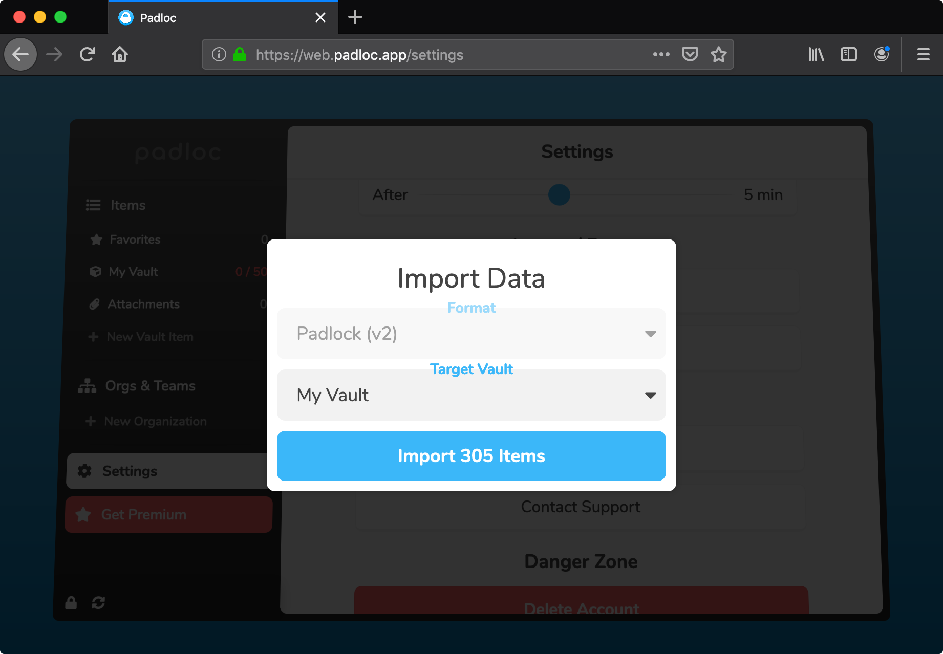 Now you’re ready to import your data into your Padloc 3 account! Go to settings and click “Import…". Select the file you created in step 1 and follow the instructions.