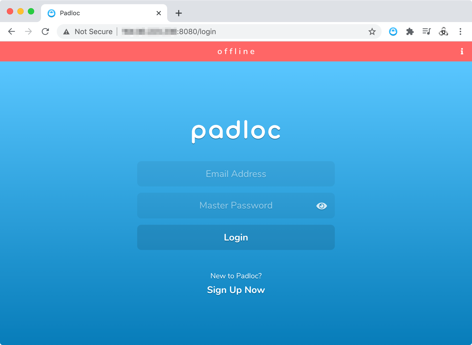 You’ll notice that the app is reporting that it is offline because it doesn’t know where to reach the Padloc server yet. Your browser will also report that the connection is not secure because we haven’t configured SSL yet. Let’s fix that!