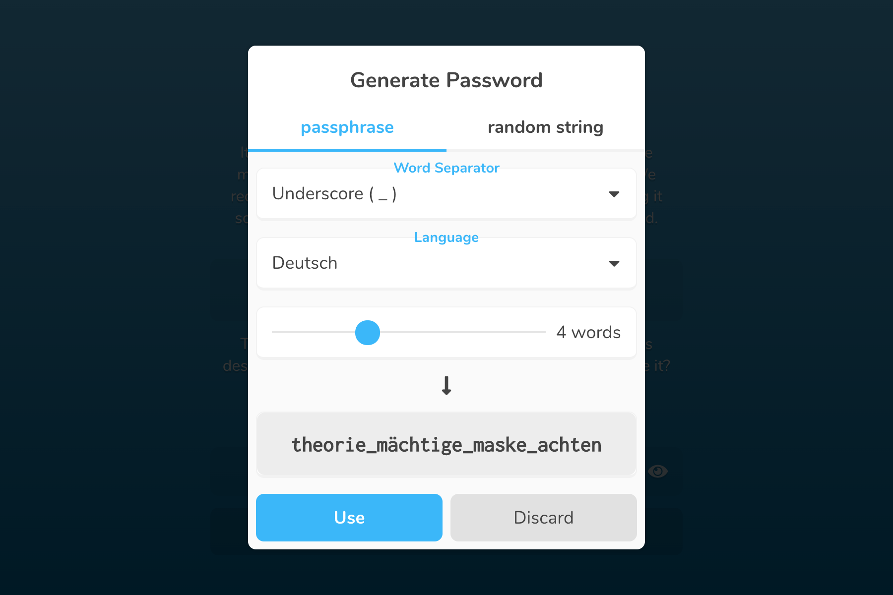 Don’t like your suggested password? No problem! You can shuffle through more random phrases by clicking Try Another One until you find one you like (the generator has been known to spit out some hilarious combinations from time to time 😋). If this still doesn’t yield the desired result, you can choose a more hands-on approach by selecting clicking Choose My Own. This will present you with the option to pick a password entirely by yourself or you can bring up a password generator that will give you much more control over how the password is generated. You can even choose a different language or increase the number of words used (4 words should be good enough for most personal uses but if you want to be safe, choosing 5, 6 or 7 words will make your password even more secure).