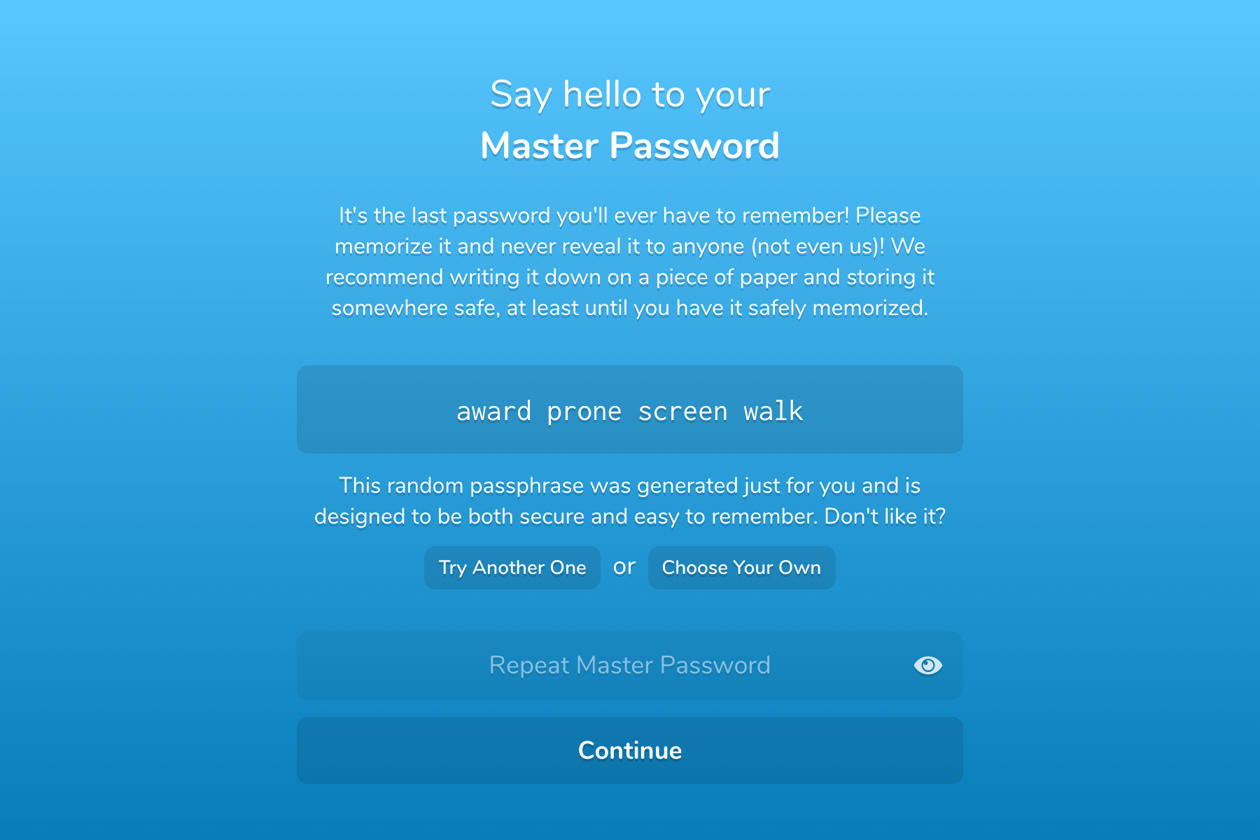 This is the most important step of the signup process (don’t worry, it is also the last) so you should pay close attention to what is happening here. Your master password is used to protect your account and all the information stored within it and although we use always use strong encryption to protect your data this protection is only as strong as the master password you choose. At the same time, we will never store a copy of your password anywhere and will not be able to help you recover it in case you forget it, so you want to make sure to use something that is both hard to guess and easy to remember. We know this is not an easy task, so the app will assist you by suggesting a strong password for you to use. This is a secure passphrase that is randomly generated from a list of the most common words in the English language (or whichever language you have set in your system preferences, as long as it is supported) using a variation of the diceware method. This passphrase may not look particularly secure, but we assure you it is likely much better than anything you would come up by yourself (no offence) and it certainly is a lot easier to remember than a string of random characters!