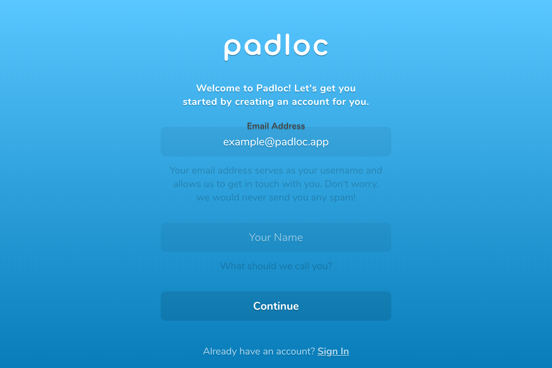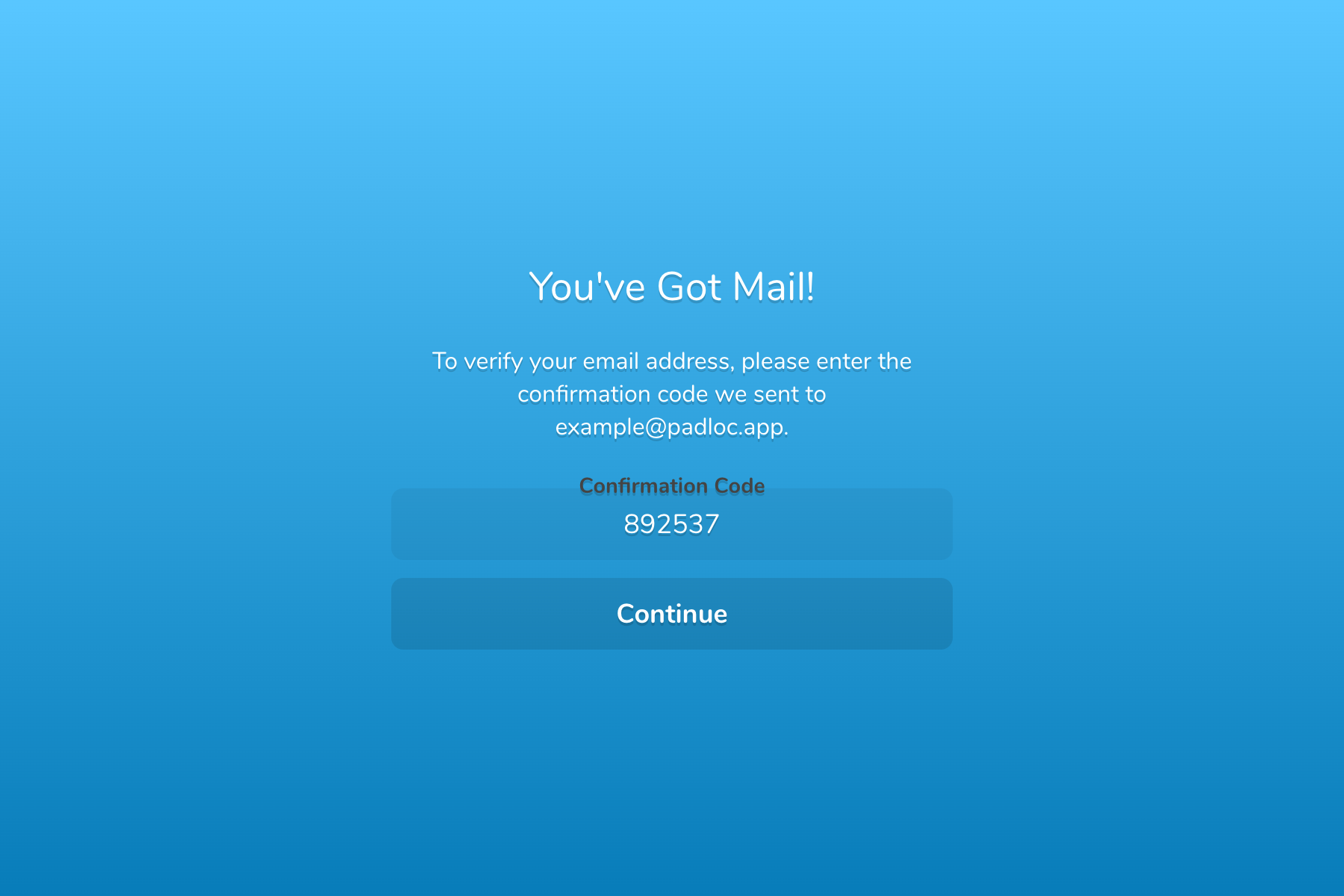 As mentioned before, your email address will be used for things like two-factor authentication and will generally identify your account within Padloc, so we first need to make sure you actually own it. To do this, we will send you an email with 6-digit confirmation code. To proceed, simply enter this code in the provided field and click Continue.