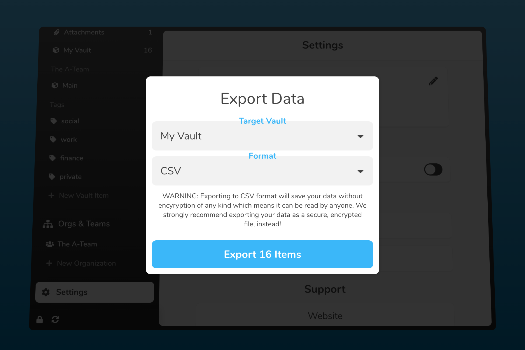 - Choose a password to protect your data. This does not have to be the same as your master password but should be sufficiently strong. The app will warn you if you choose a password that is considered too weak.