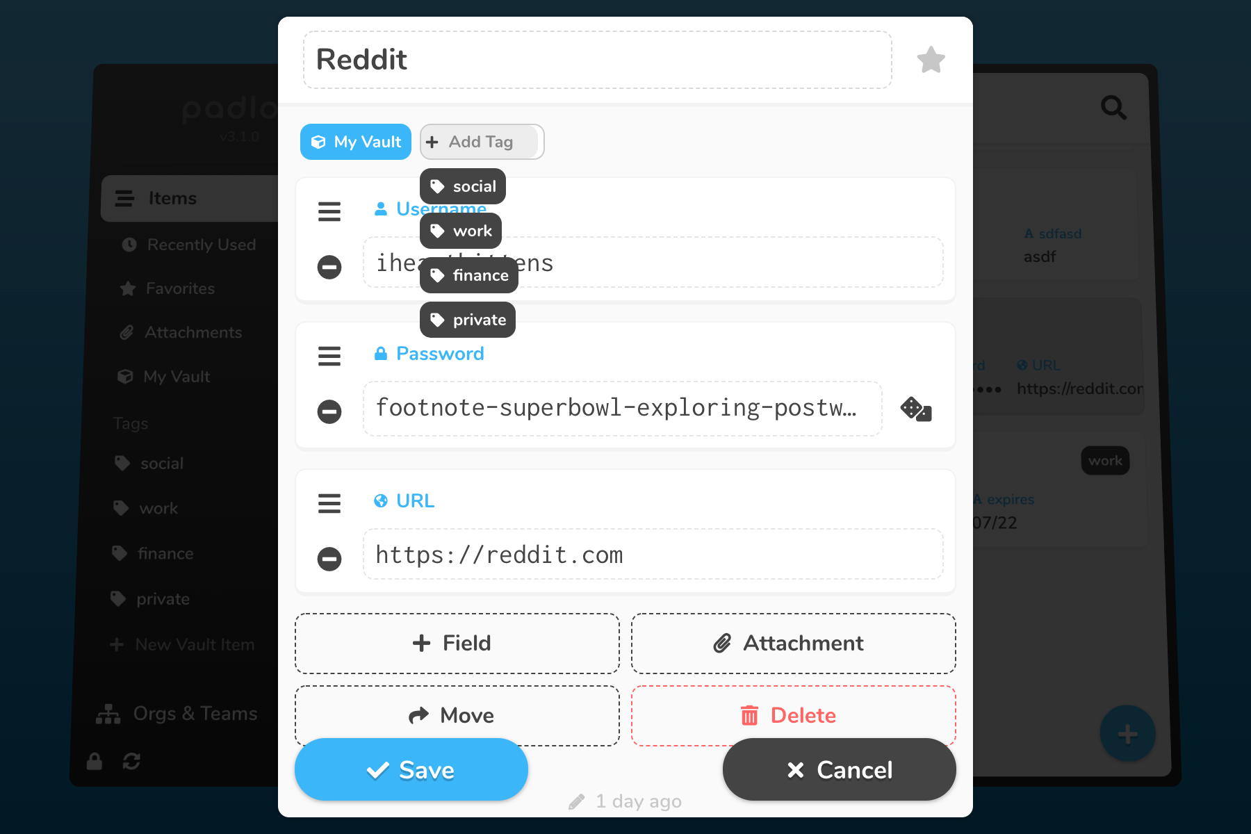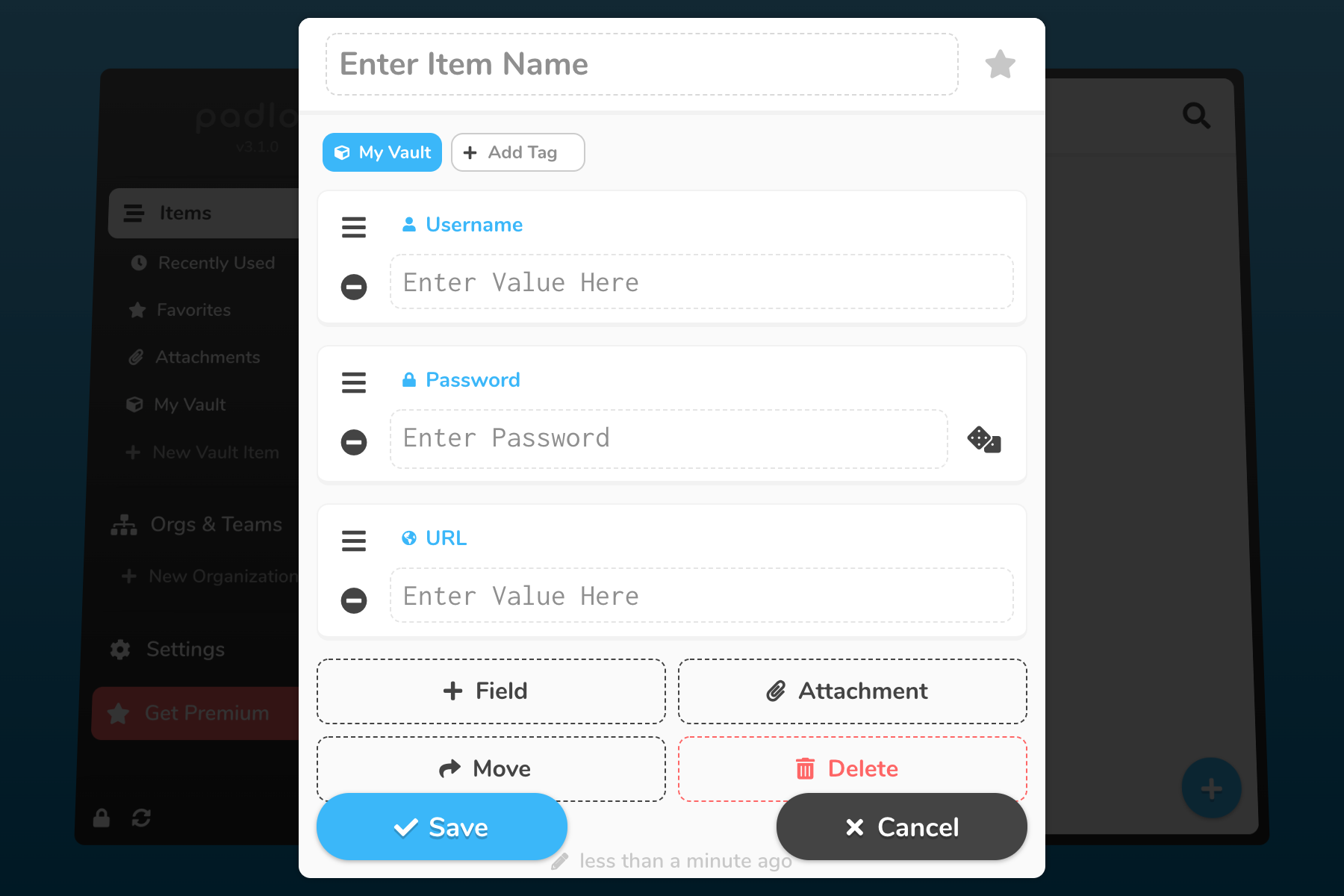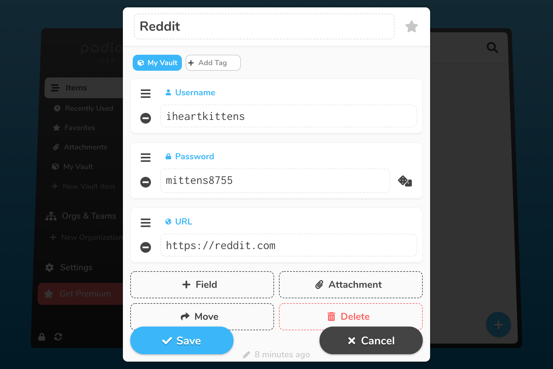 Now we’re getting somewhere! Since we chose the Website / App template, Padloc has added the fields Username, Password and URL for us. Again, these are just the default fields for this template. You can add and remove fields and edit field names at any time. For now, let’s just fill this out and click Save. Don’t forget to add an item name by filling out the field in the top!