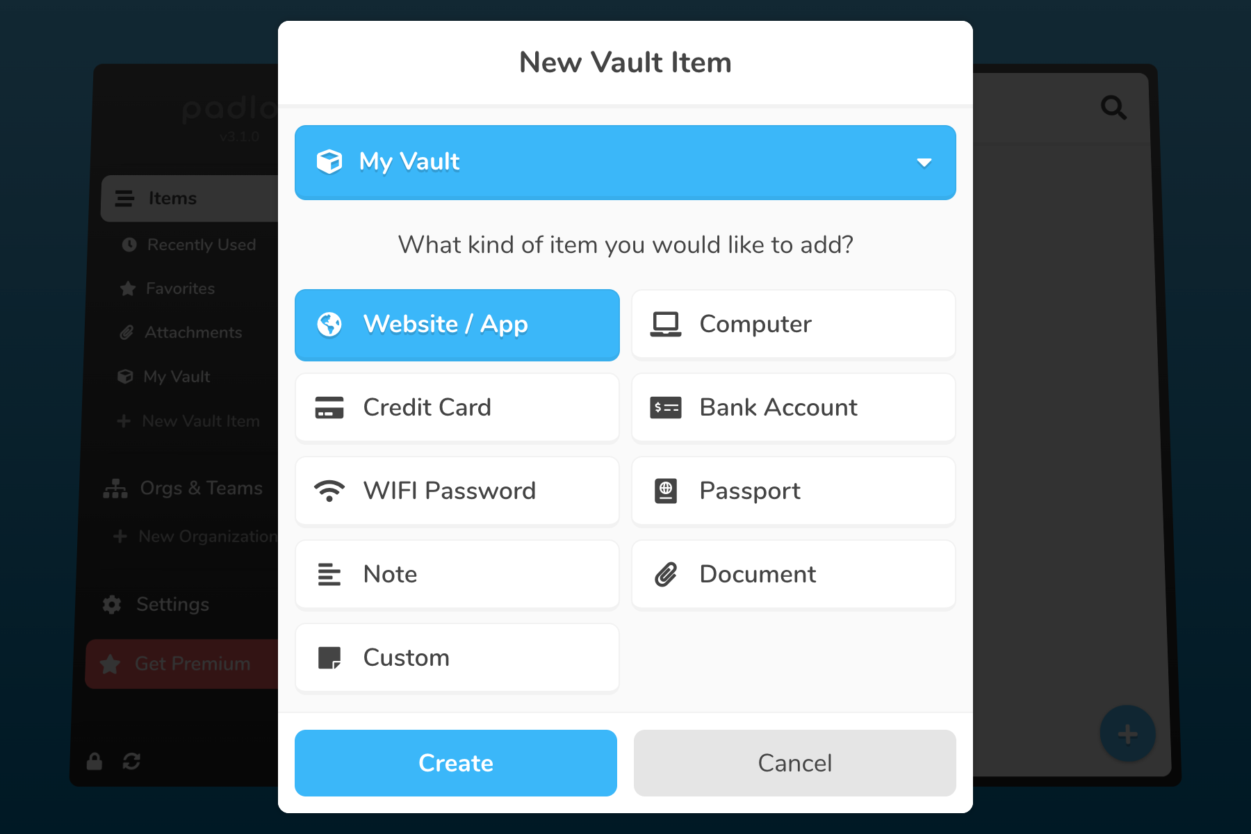 Look at all those options! We didn’t lie when we said that Padloc can store all kinds of information. In fact, you have absolute freedom in deciding what kind of data your vault items should hold. The options presented here are merely predefined templates provided for your convenience and you can always add and remove data as the mood strikes you (more about how that works in a moment). Notice that you can also choose which Vault to save the item to. We only have one Vault at this point so that one will have to do (to learn how to create new Vaults and share them with others, check out Organizations & Shared Vaults). Let’s select Website / App and see where that get us. Click the button labeled Create to continue.