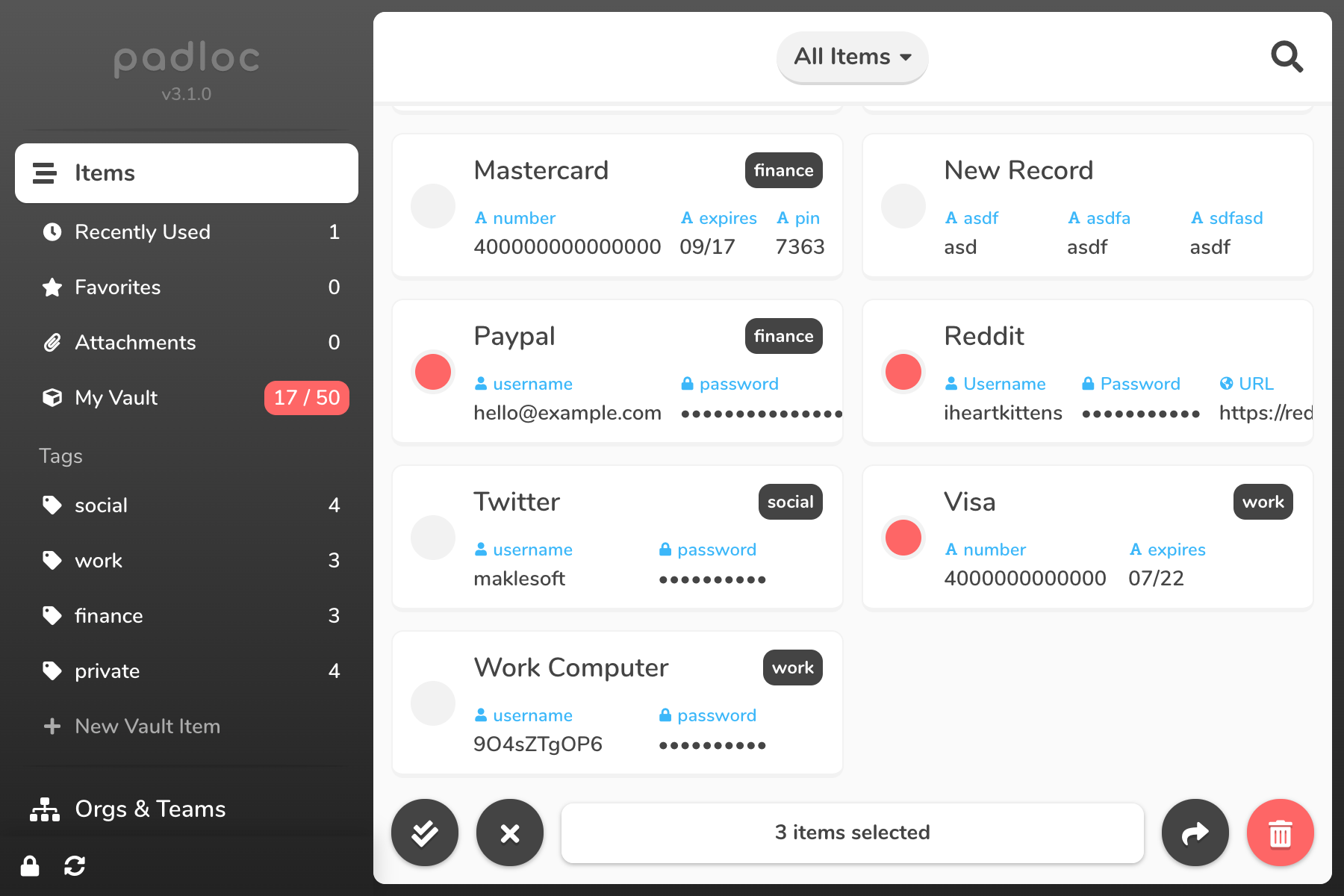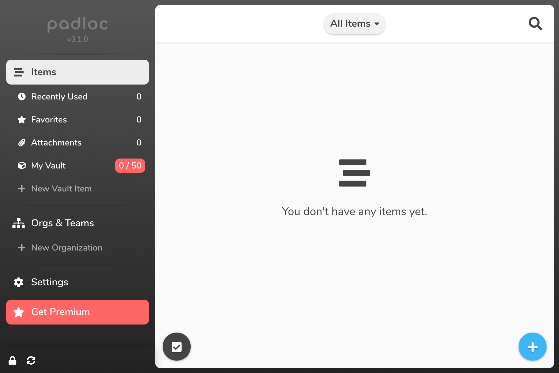 After creating your Padloc account, you’ll start off with a single Vault called “My Vault”. This vault is meant only for you and is where you’ll to store all your personal data. For a lot of users, one Vault will be more than enough, as it can hold an arbitrary number or items (given you have the Premium plan) and there are plenty of ways to organize and discover items within it (you can read more about that in the Searching & Filtering section). If you want to learn about how to create new Vaults and share them with other Padloc users, check out Organizations & Shared Vaults.