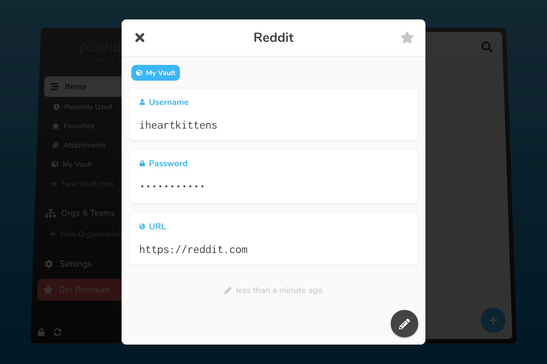 This is where it gets interesting! You may have noticed that the password we chose for our Reddit account is … well … not particularly strong. But we’ve got Padloc to remember all our passwords now so there is no excuse for abusing our pet names for this purpose anymore. Let’s change this to something more worthy of the name “password”. Padloc can help us with this by generating a random password for us. Let’s see how that works! See the little icon next to the password field? (Those are dice in case you didn’t recognize it) Clicking it will bring up the Password Generator.
